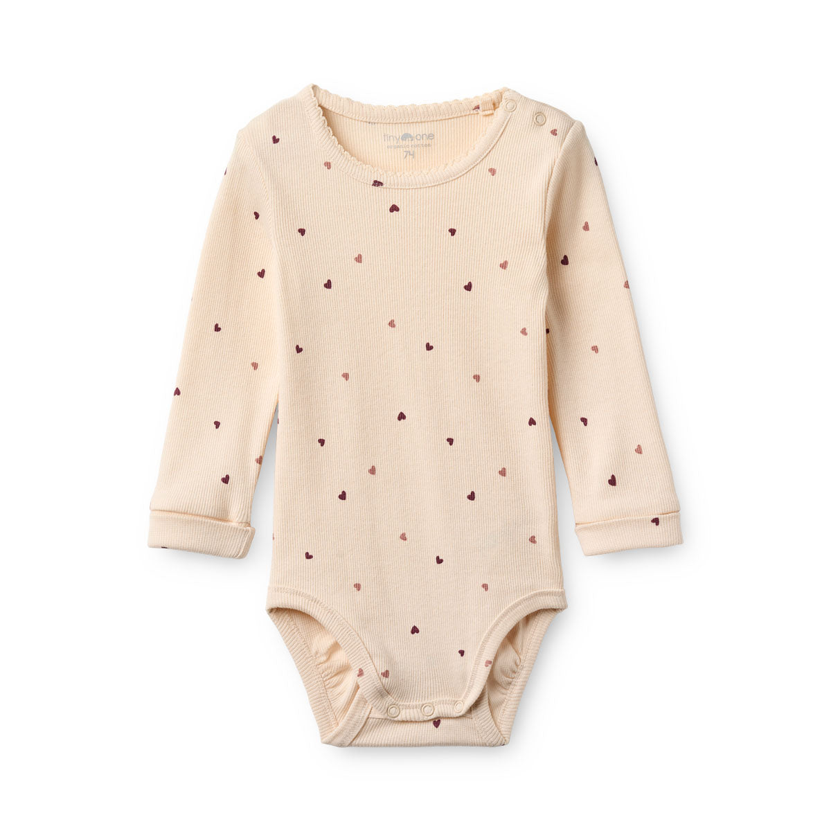 Langærmet body med sødt hjerteprint og fin hæklet kant ved halsen. Designet med extended size, så dit barn kan have glæde af den i længere tid.
