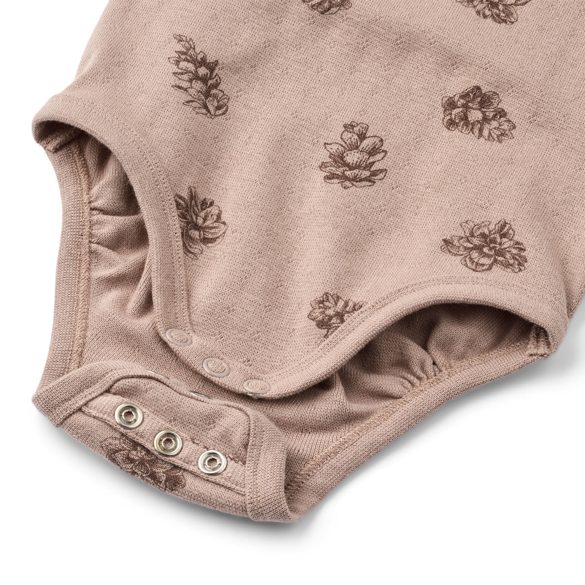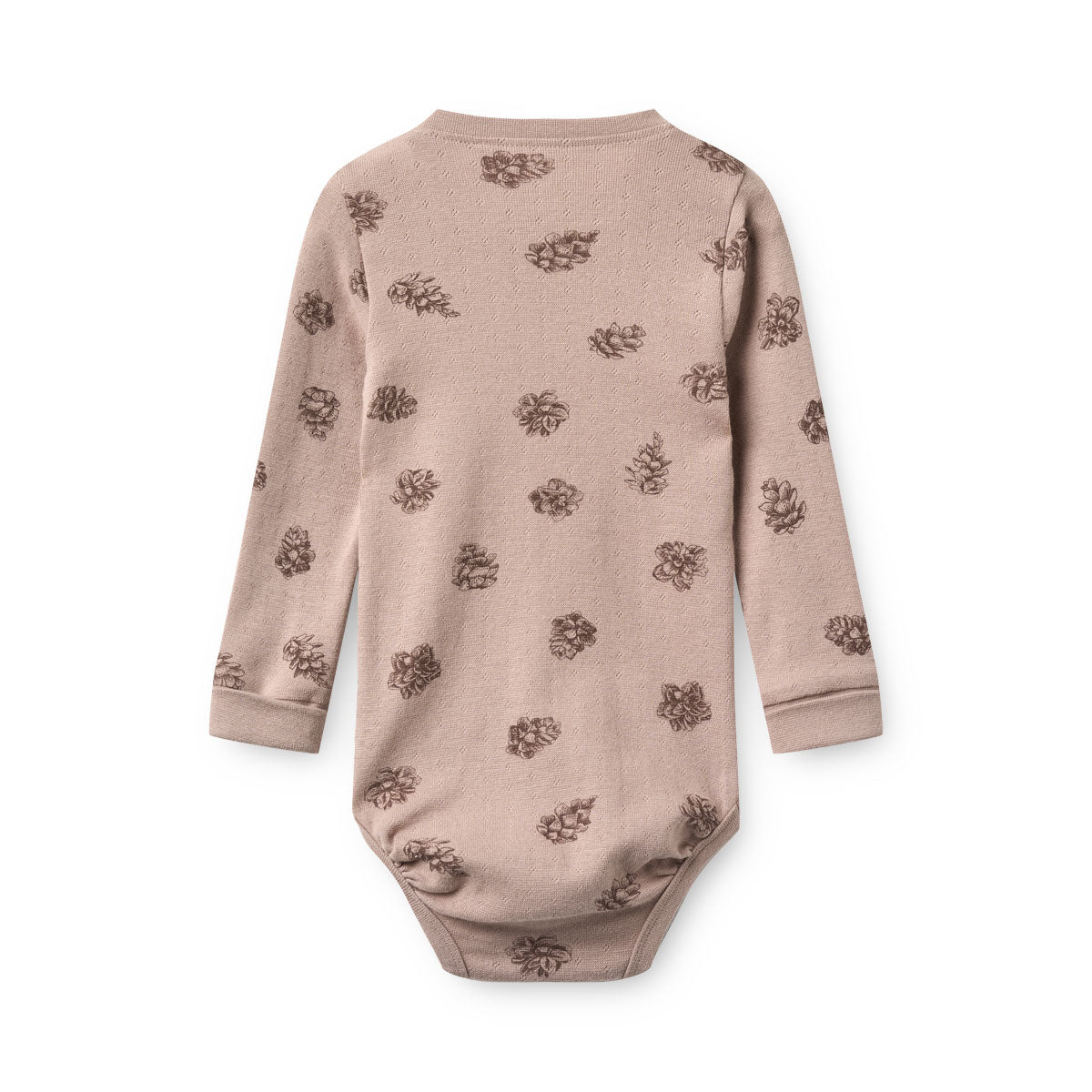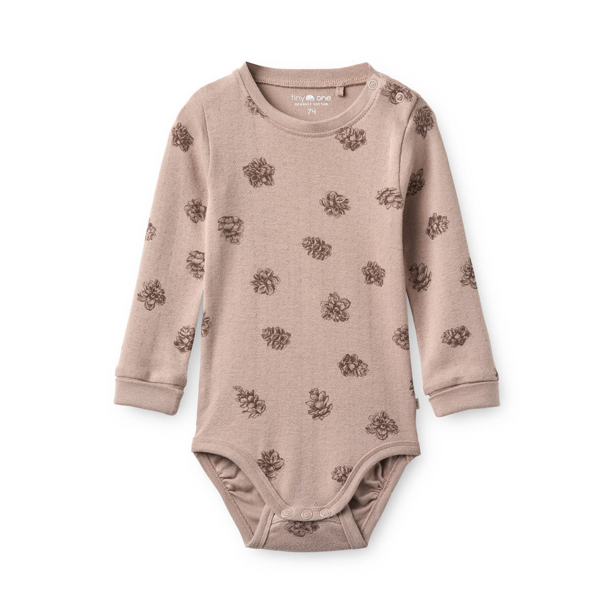 Langærmet body i blød pointelle med smukt kogleprint. Designet med extended size, så dit barn kan have glæde af den i længere tid.